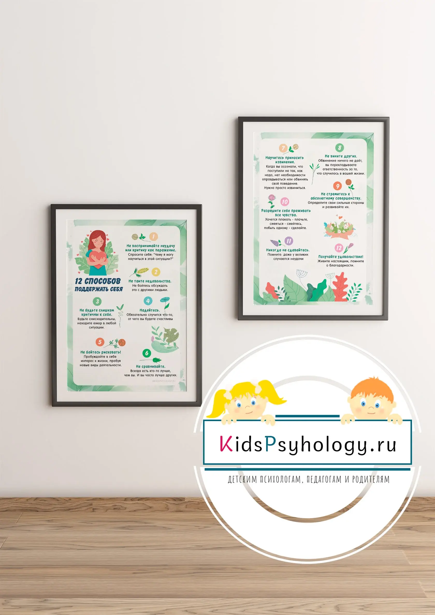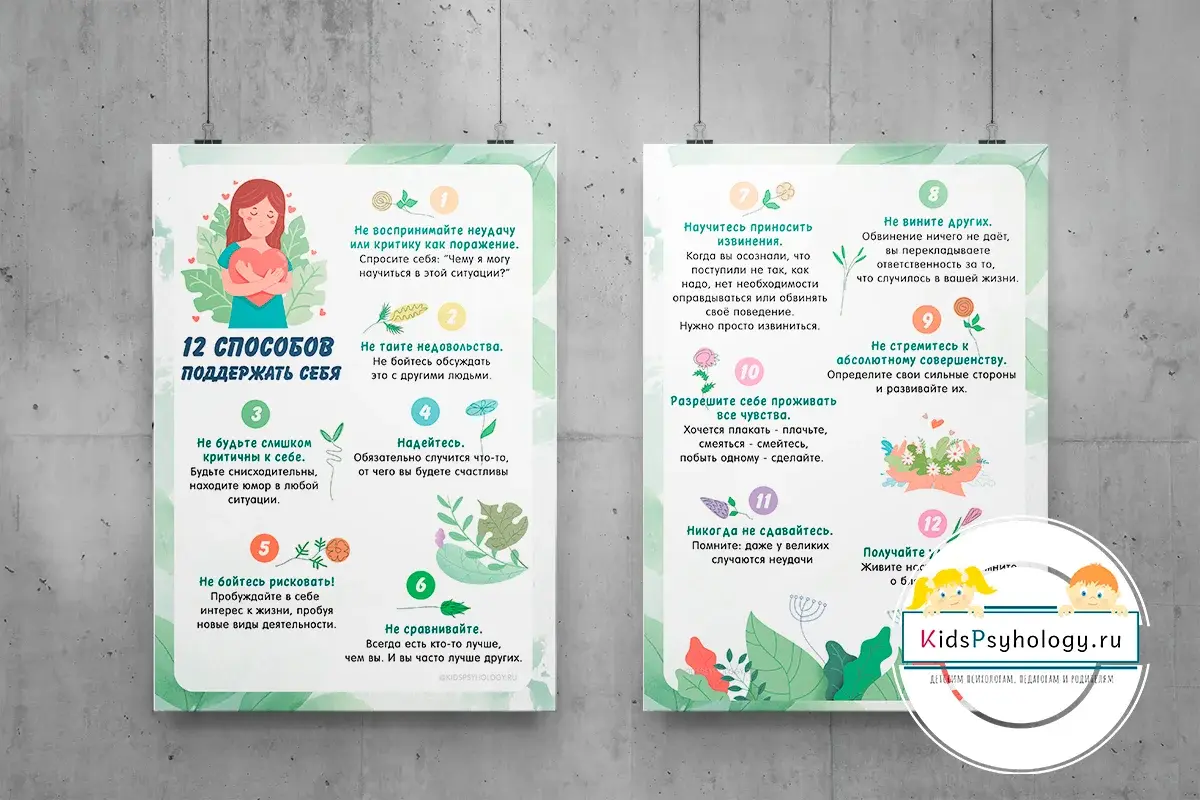 Набор из 2-х плакатов "12 способов поддержать себя" предназначен для широкого круга участников образовательного процесса (педагогов, родителей, детей и др). Плакаты можно разместить в кабинете, группе, классе, на стенде или использовать в качестве раздаточного материала, а также в мультимедийной презентации.