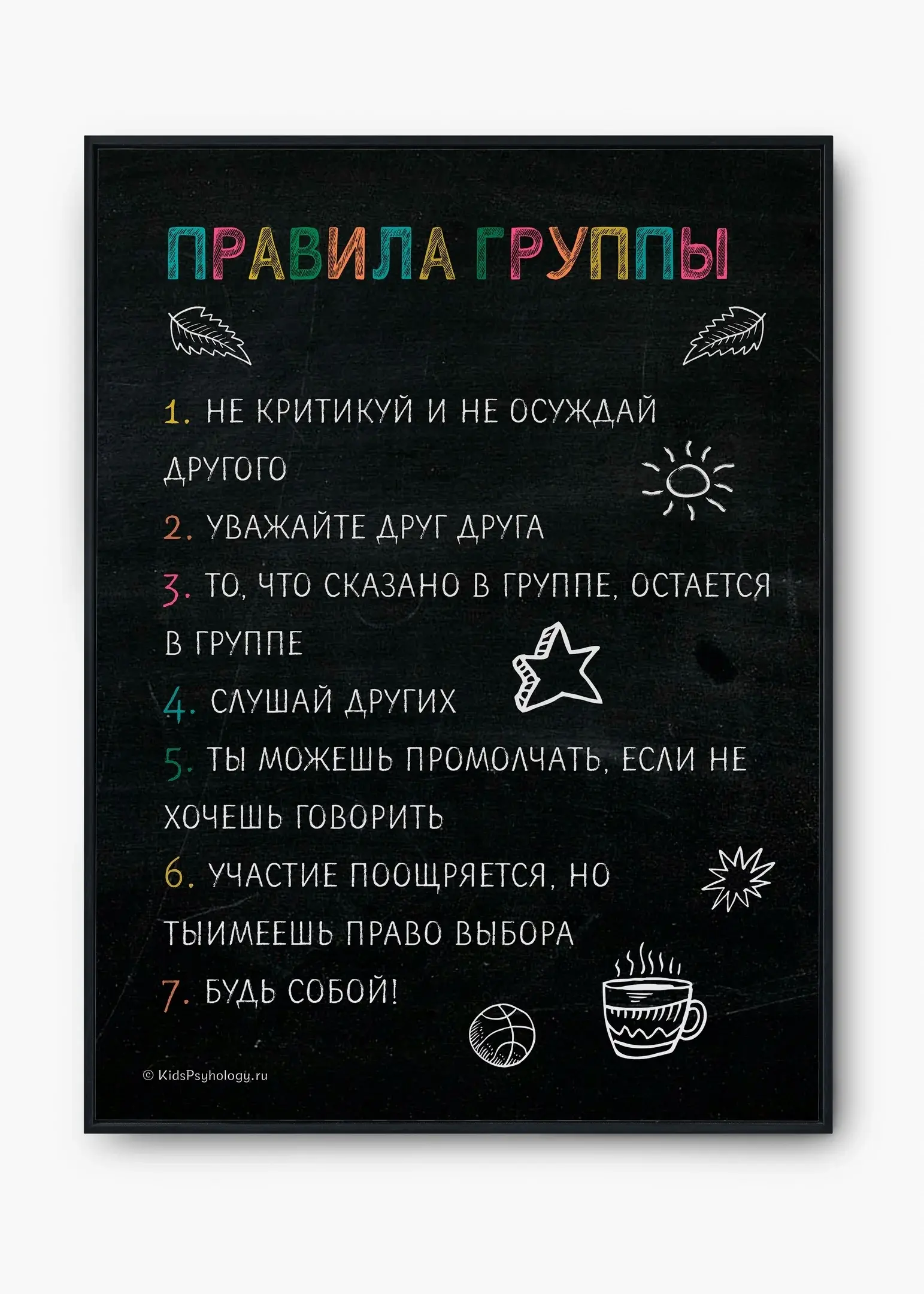 Список правил для проведения семинаров, тренингов, мастер-классов, групповой психотерапии поможет организовать членов группы и задать правильные установки с самого начала мероприятия. Комплект станет отличным помощником для педагогов-психологов, социальных работников, и психотерапевтов!