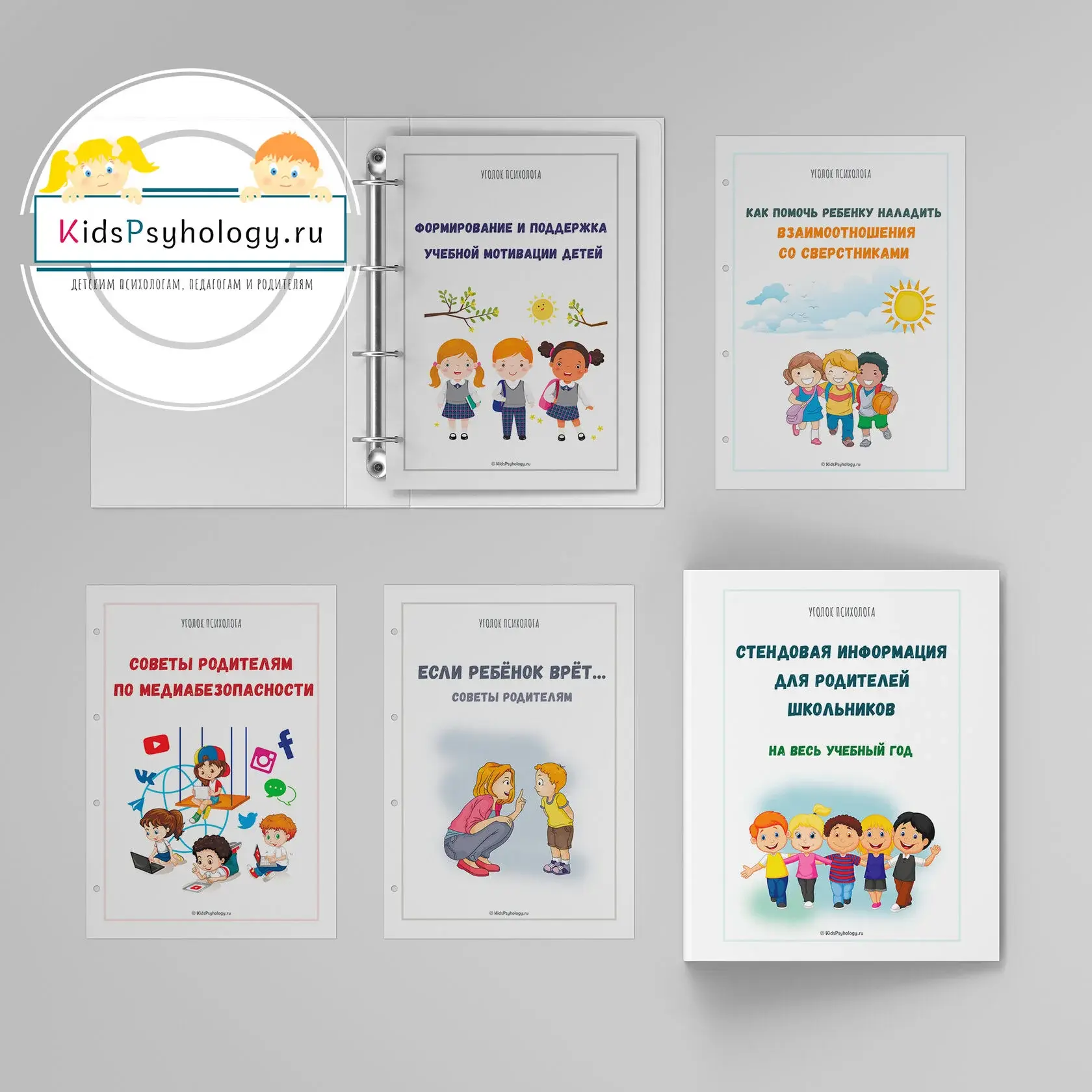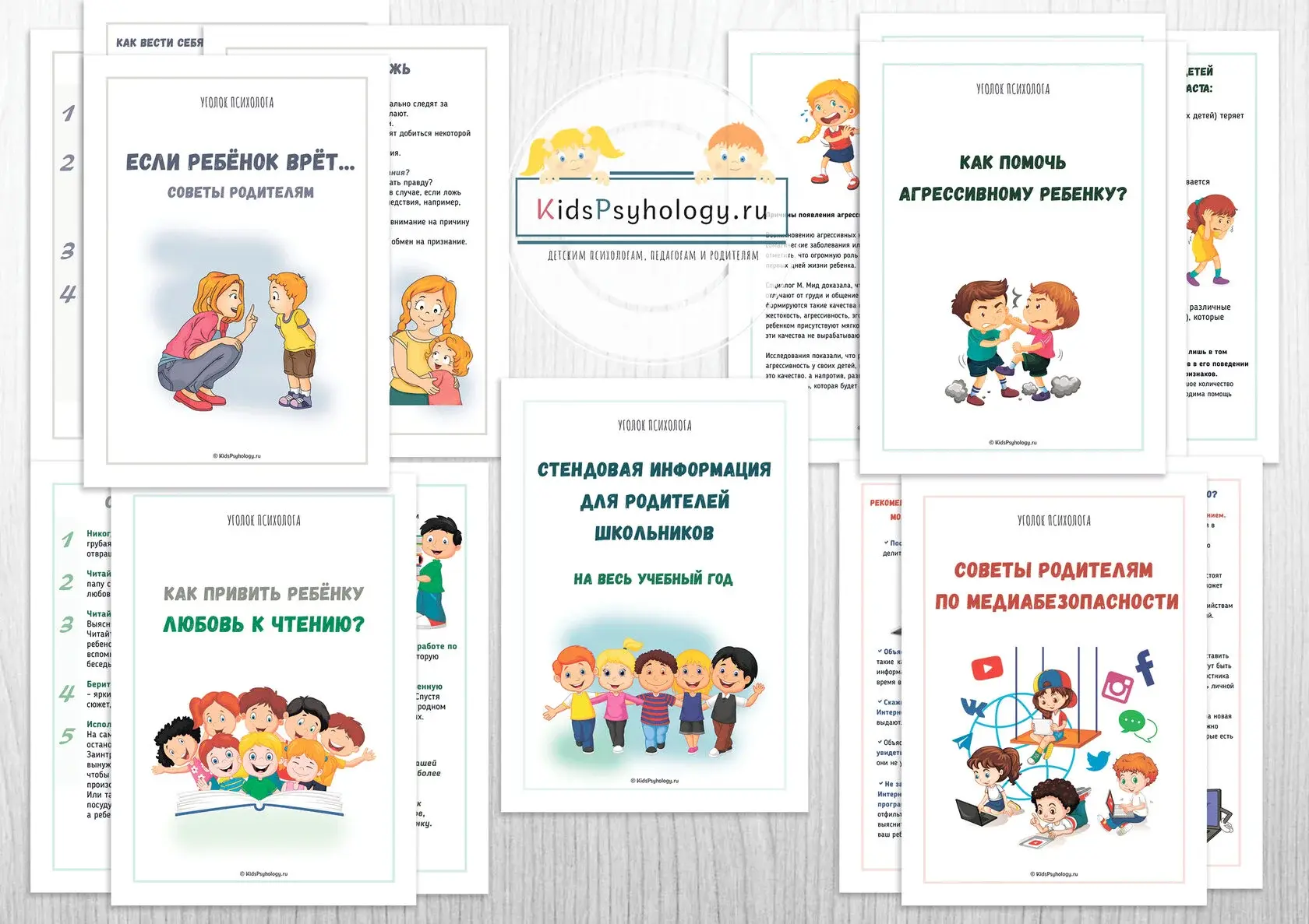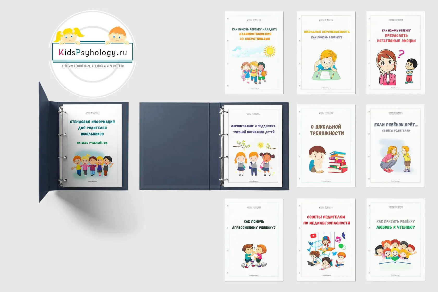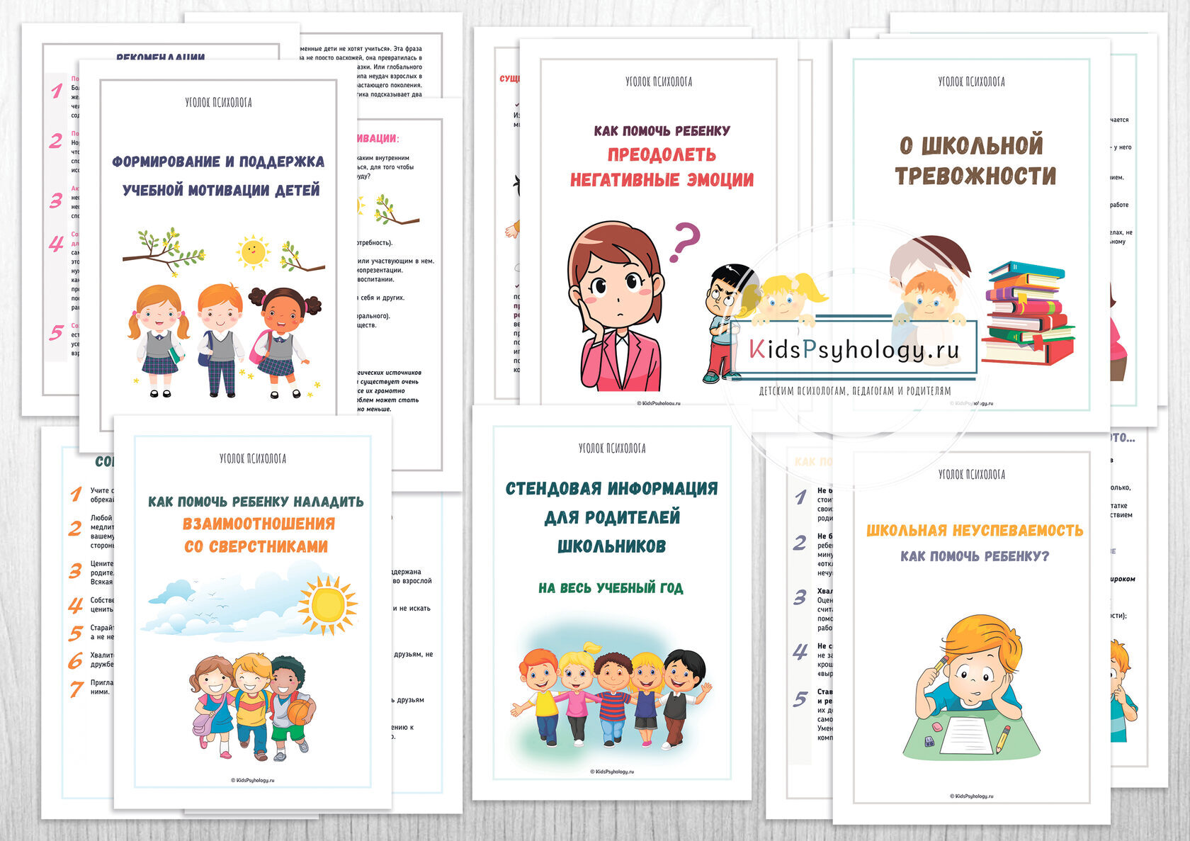 Комплект Стендовая информация для родителей на весь уч.год "Уголок психолога" (школьный возраст) - это 34 страницы готовых цифровых файлов для печати.
