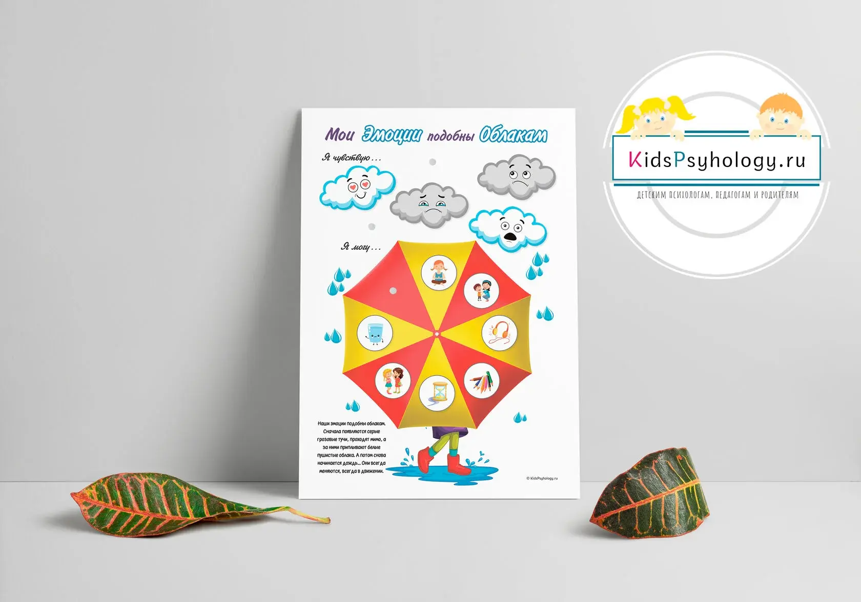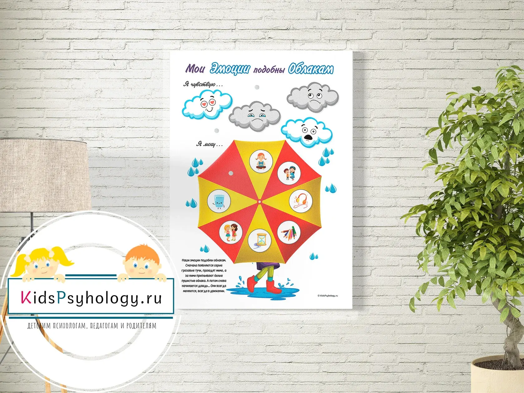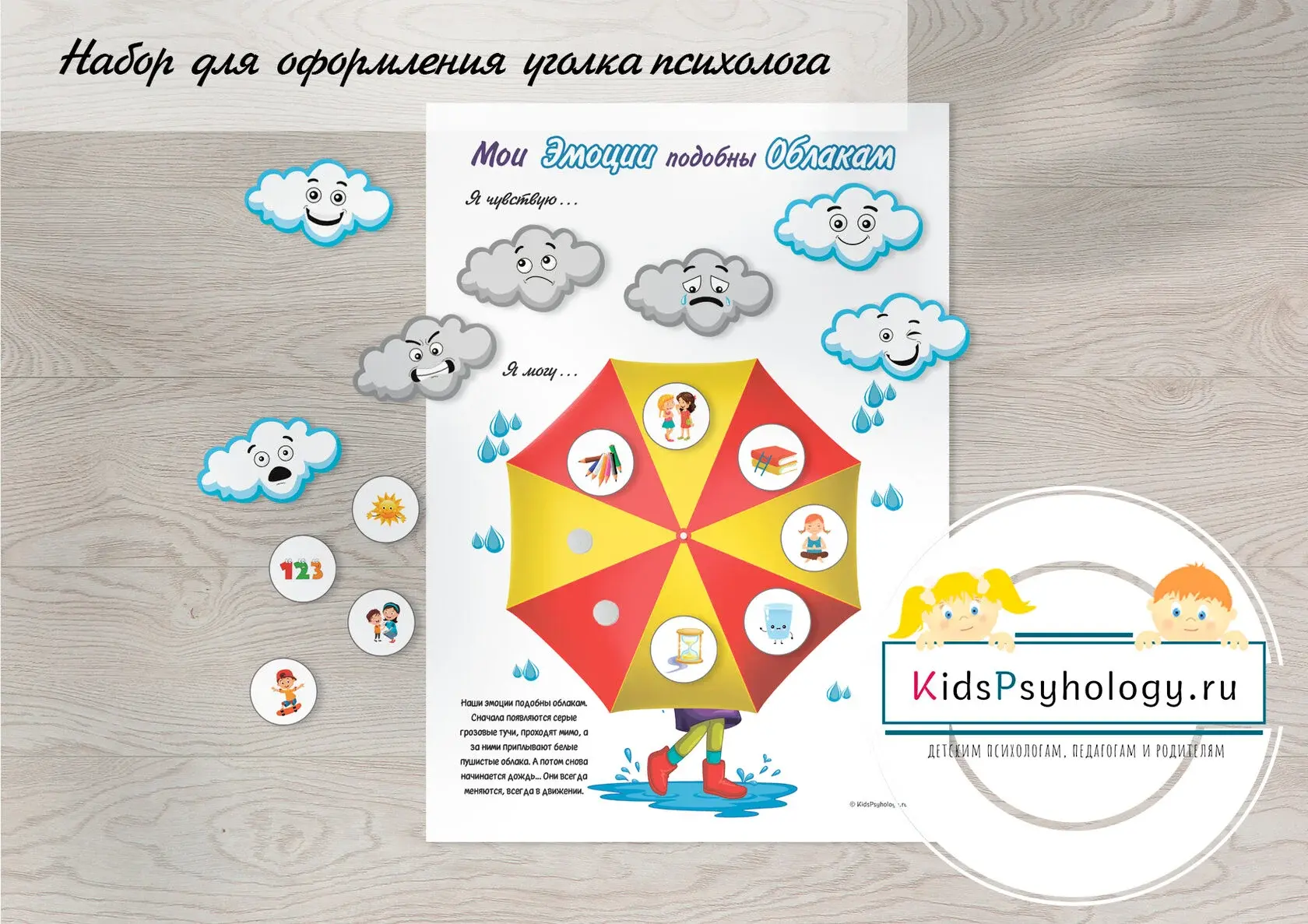 Набор для оформления уголка психолога "Эмоции подобны облакам" - это 2 в 1, яркий красочный плакат и методическое пособие для изучения, закрепления чувств и эмоций детей, знакомства с различными способами управления своим эмоциональным состоянием.
