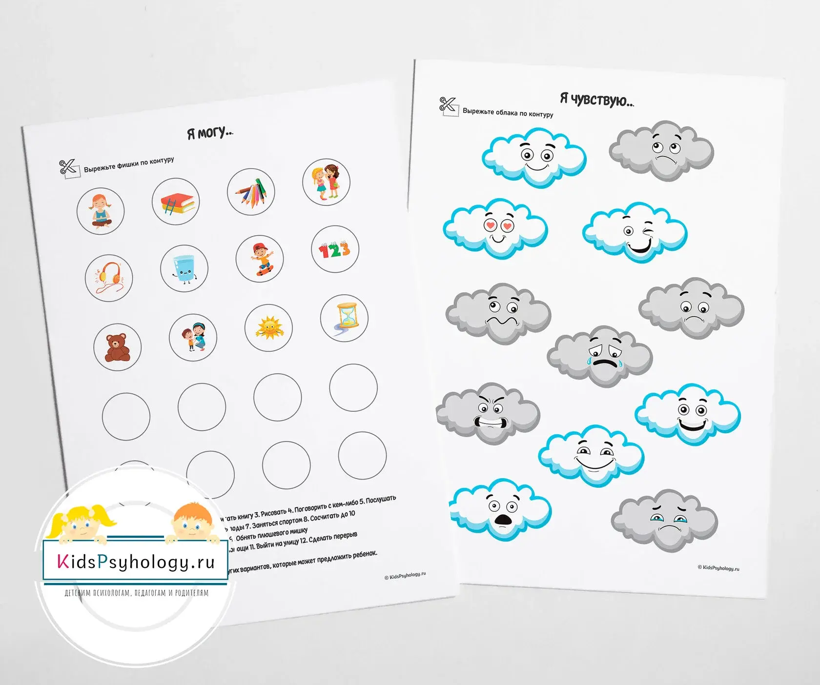 1 плакат-основа, 1 лист с изображениями облачков-эмоций "Я чувствую", 1 лист с фишками "Я могу".