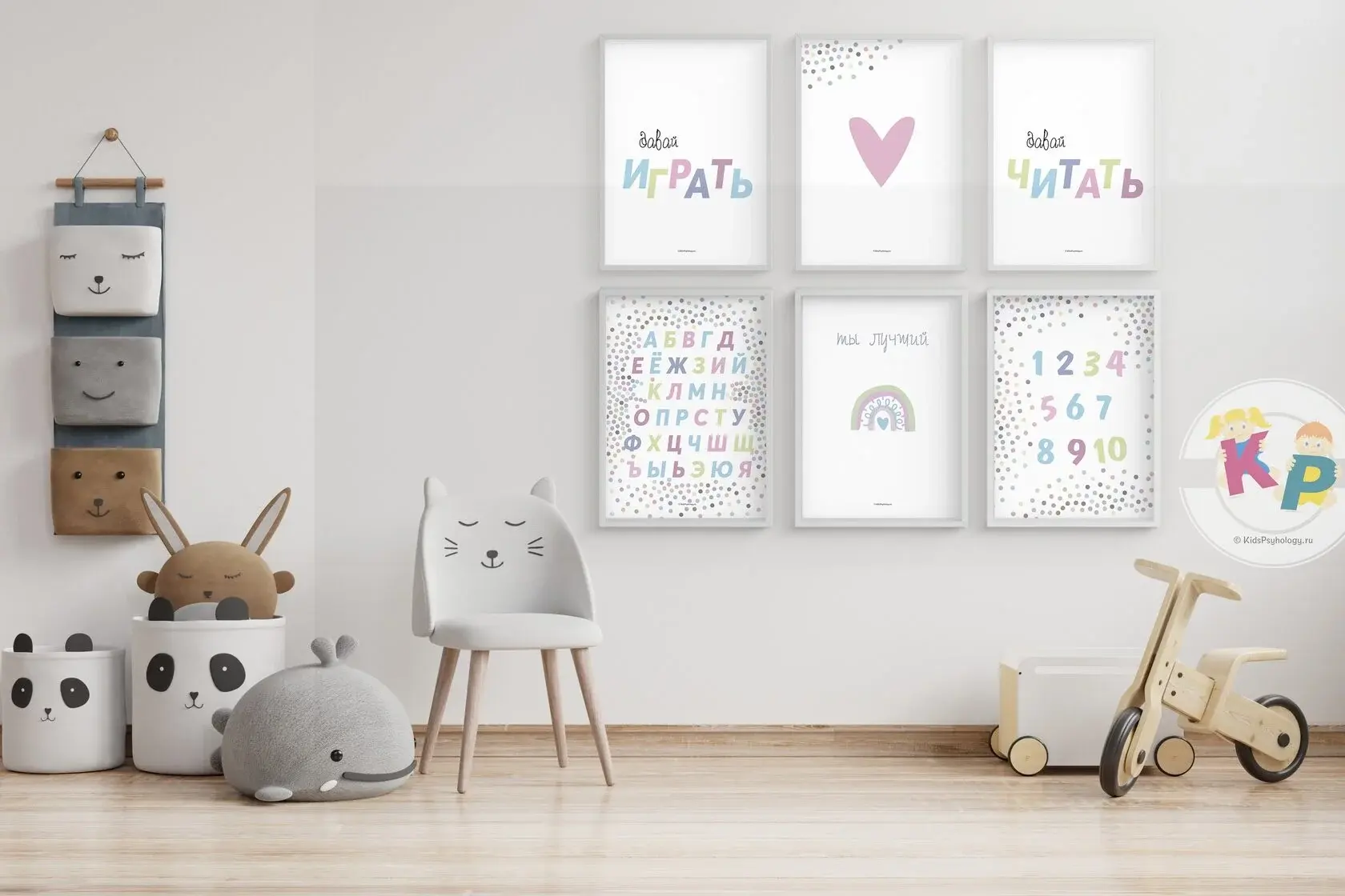 Набор из 6 постеров для игровой зоны в пастельных тонах. Минималистский и современный стиль впишется в любой интерьер игровой зоны, комнаты или кабинета детского психолога.