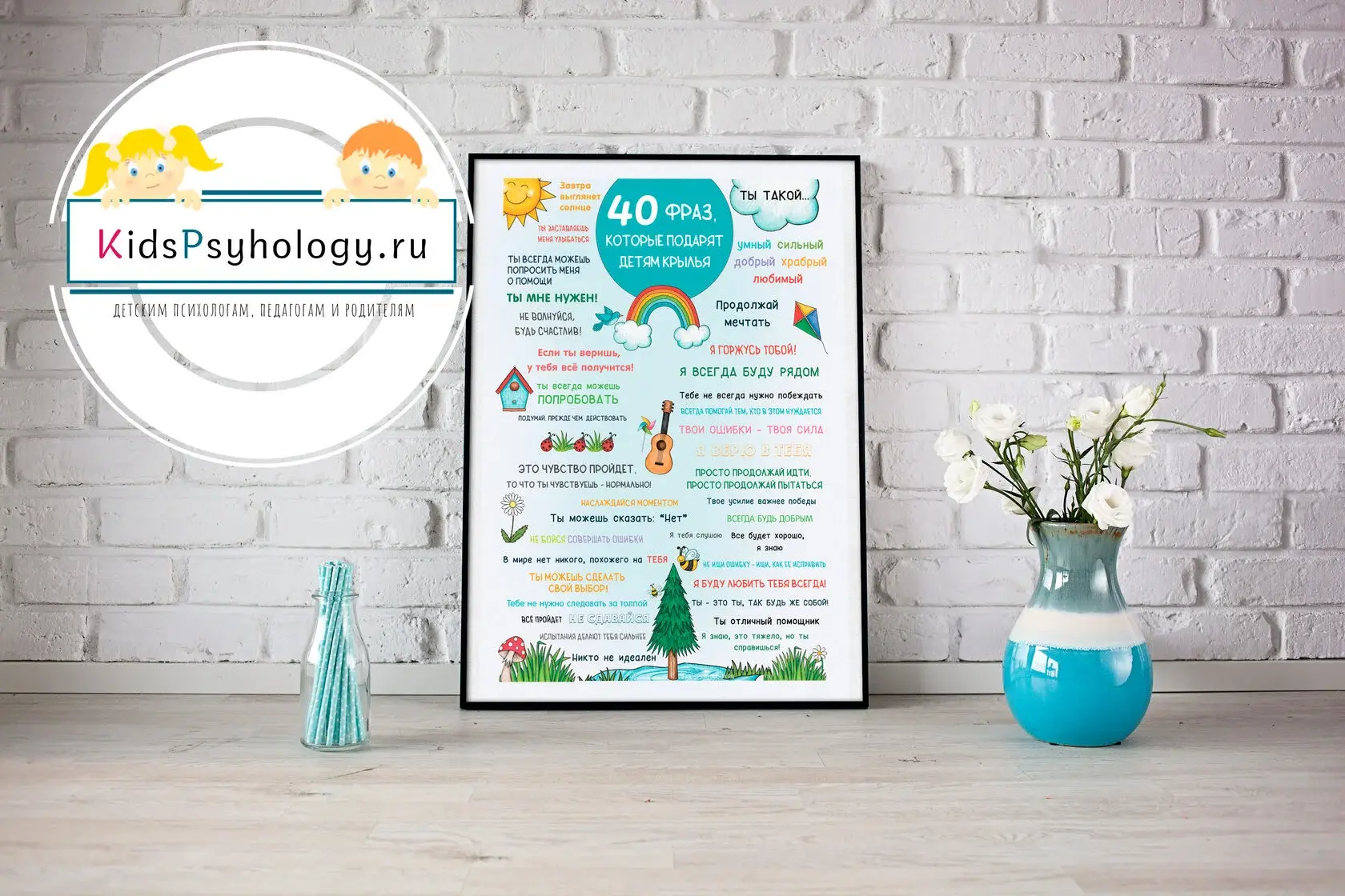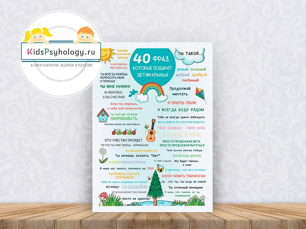 Как часто нам не хватает слов, чтобы выразить ребенку свою любовь и поддержку. Плакат "40 фраз, которые подарят детям крылья" станет визуальным помощником и напомнит взрослым о самых важных словах в жизни каждого ребенка.