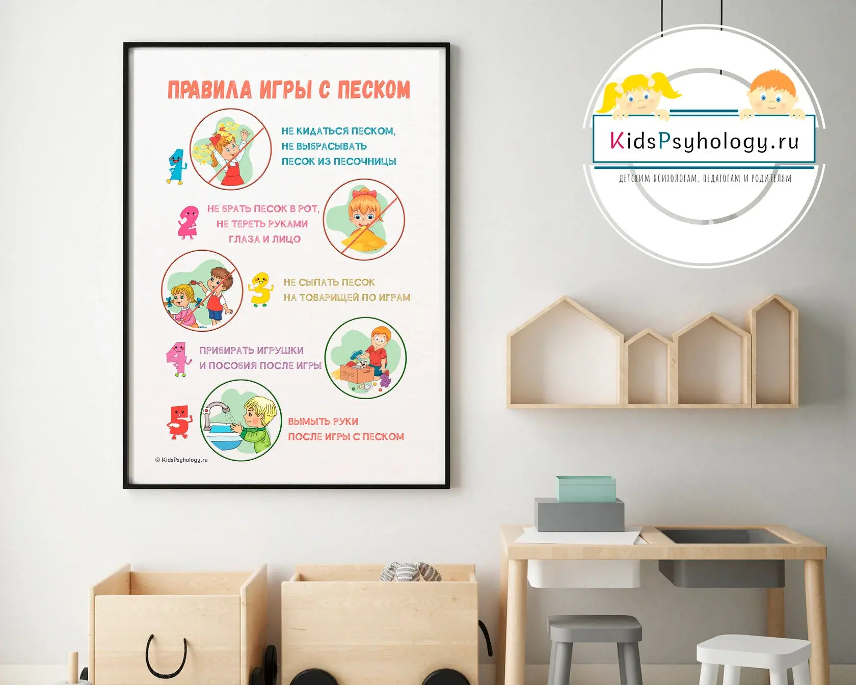 Несмотря на то, что при проведении песочной терапии не задаются жёсткие рамки, всё же соблюдение некоторых правил необходимо. Чтобы избежать нравоучений , познакомить детей с этими правилами можно с помощью демонстрационных материалов. Дополнительные визуальные стимулы позволят быстрее запомнить основные правила безопасного обращения с песком и в любой момент обращаться к ним при необходимости.