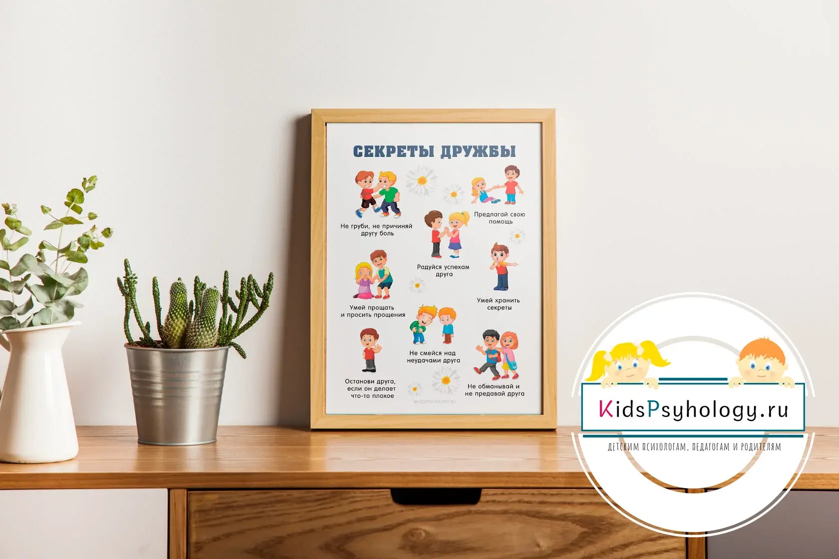 Плакат "Секреты дружбы" в наглядной форме поможет детям понять правила дружбы, а также поможет создать добрую и уважительную атмосферу в группе, классе или кабинете. Постер также можно разместить на информационном стенде