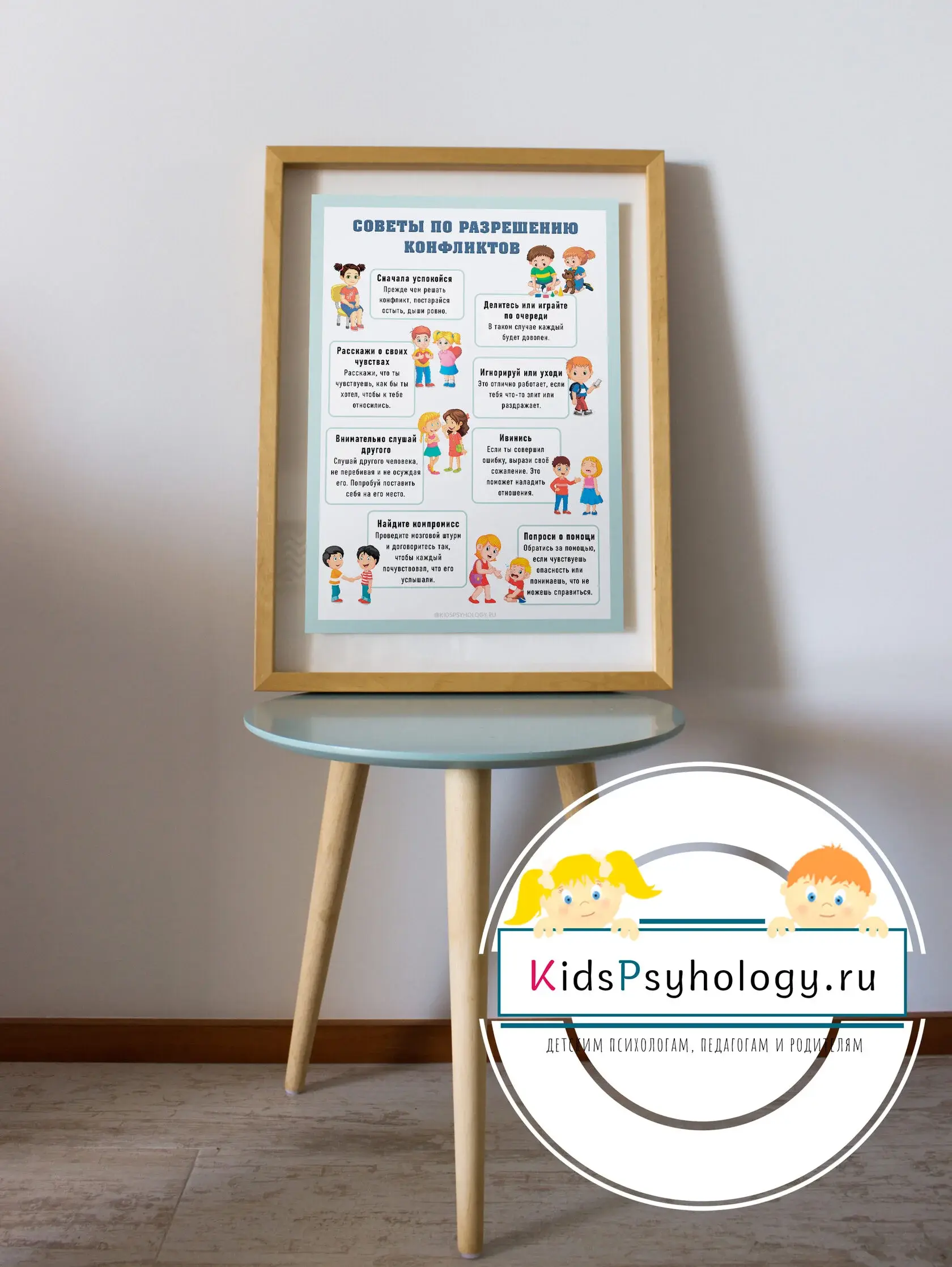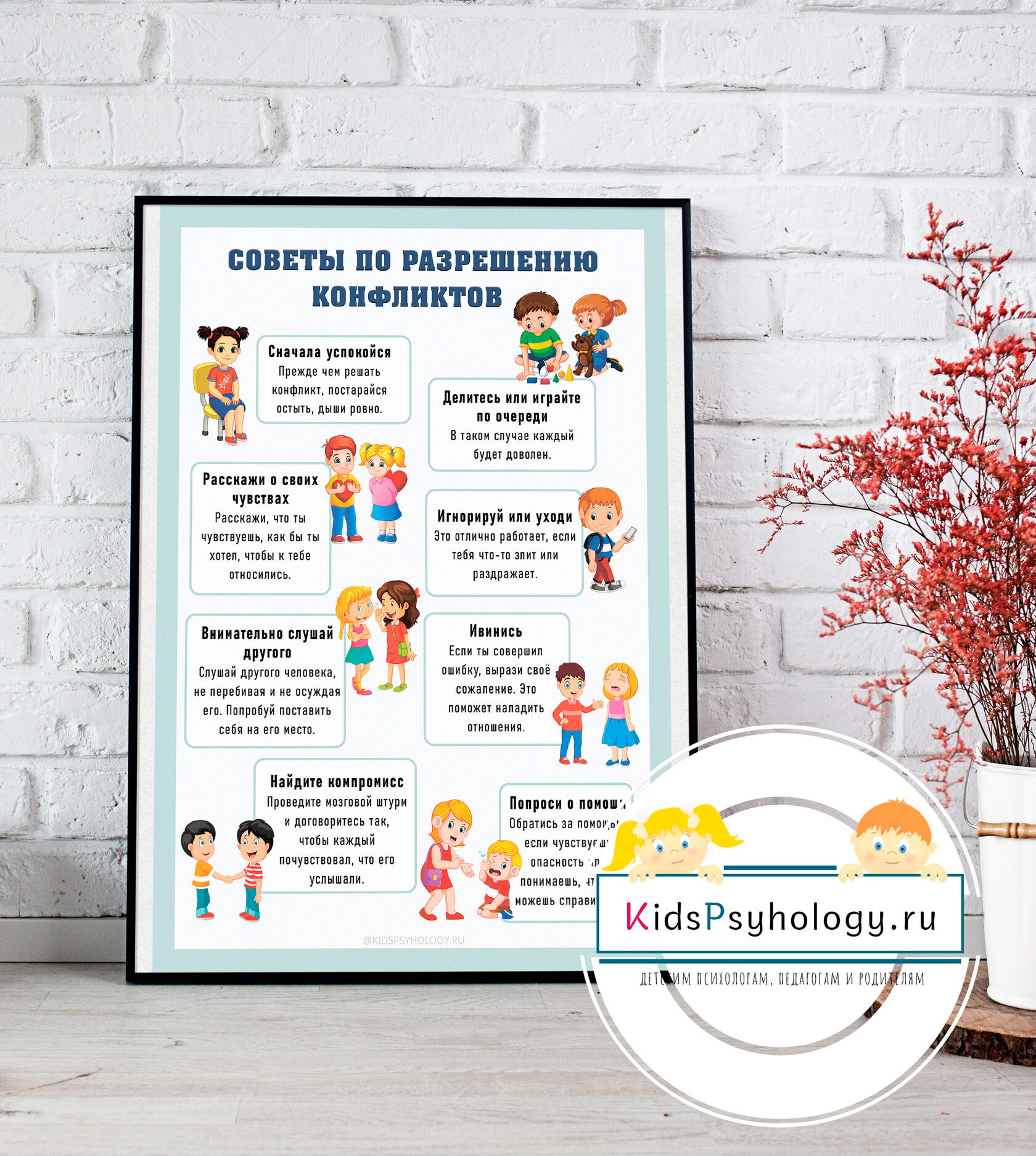 Плакат "Советы по разрешению конфликтов" поможет продемонстрировать детям различные способы решения конфликтных ситуаций, а также поможет создать добрую и уважительную атмосферу в группе, классе или кабинете. Плакат можно разместить на информационном стенде