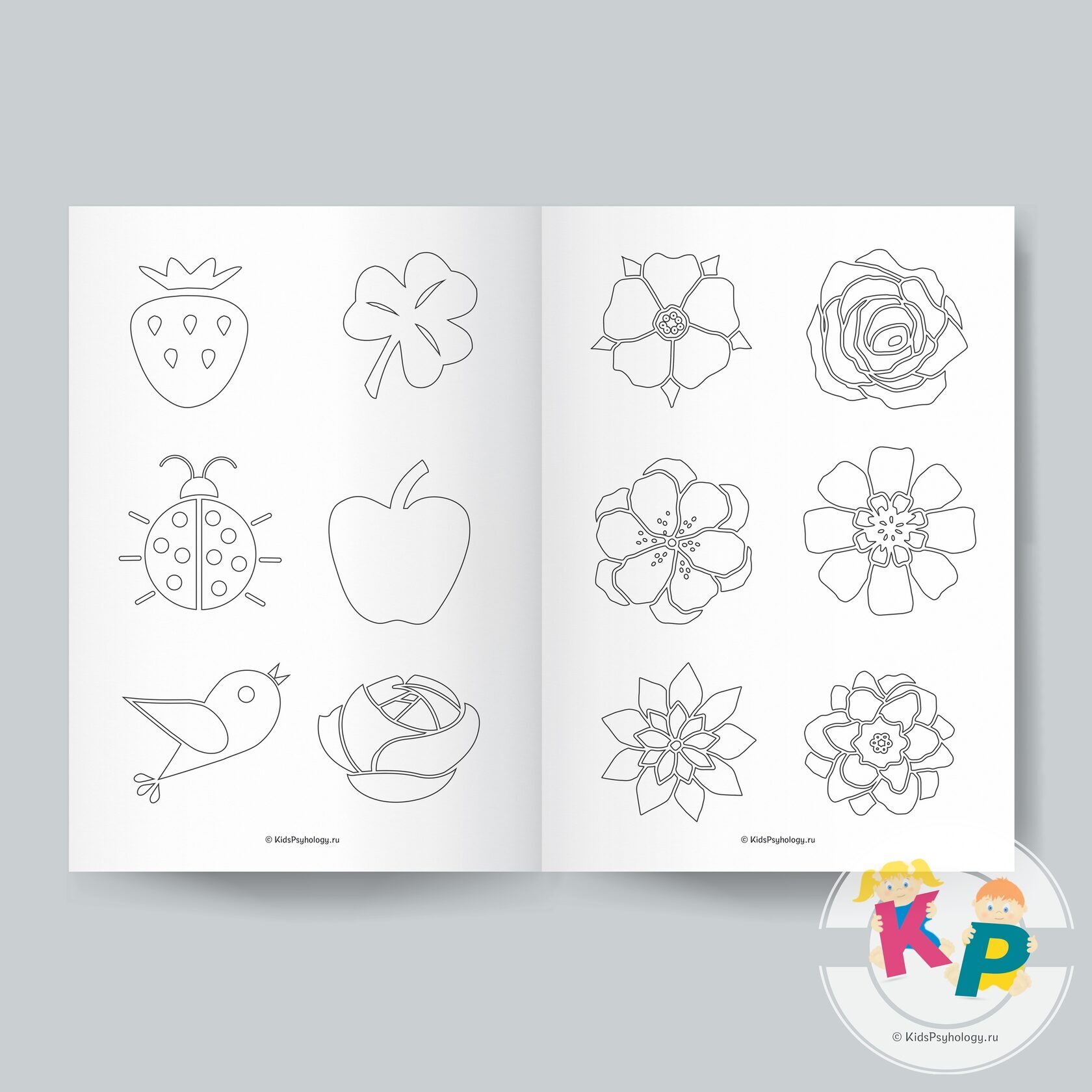 Рабочая тетрадь включает 84 пустые фигуры разных форм на 14 листах, плюс 90 примеров узоров, которые можно использовать для росписи и зарисовывания фигур.