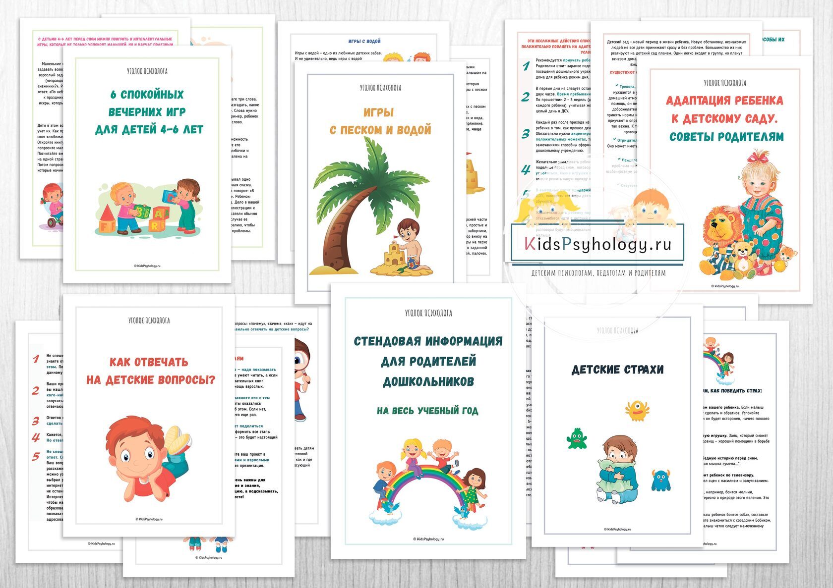 Комплект Стендовая информация для родителей на весь уч.год "Уголок психолога" - это 36 страниц готовых цифровых файлов для печати.